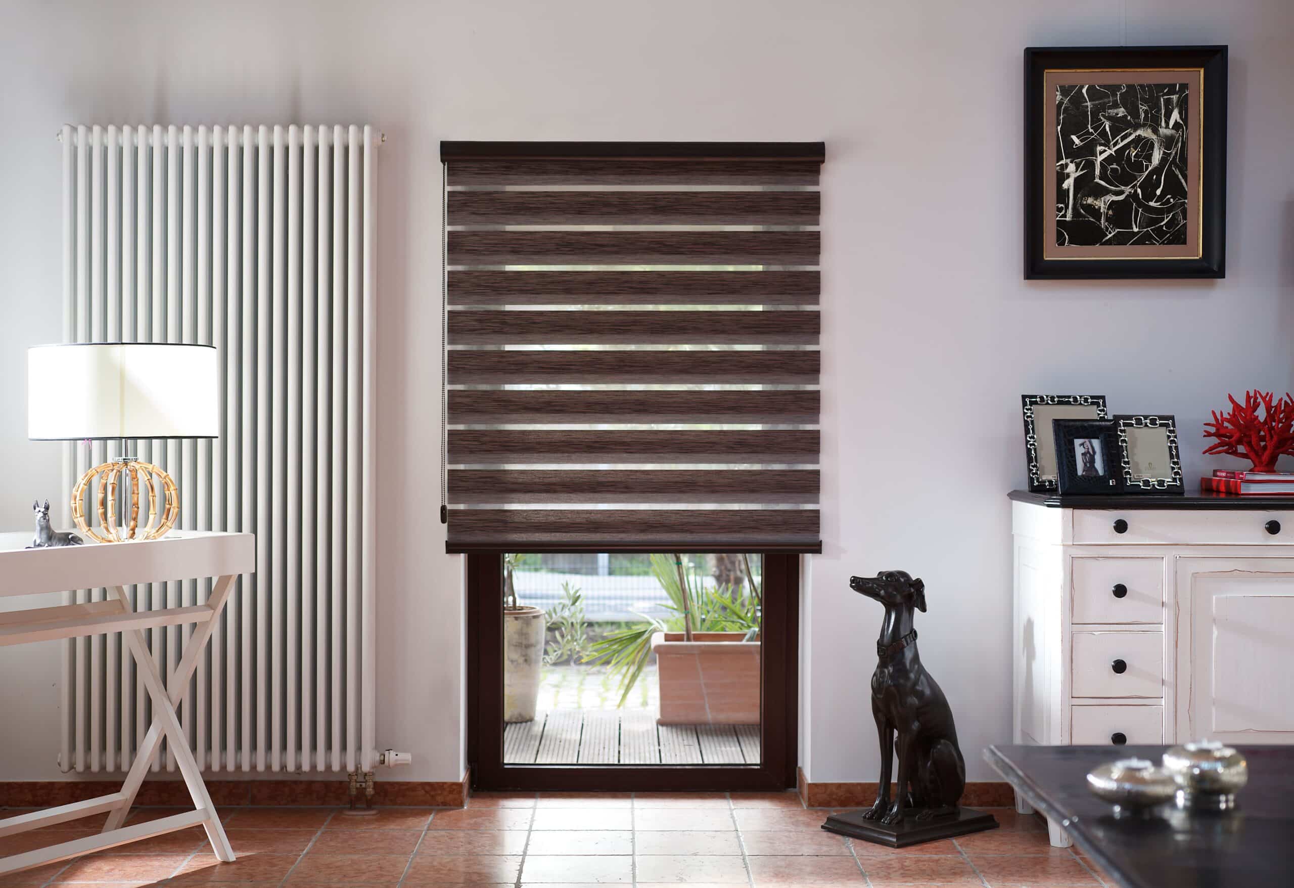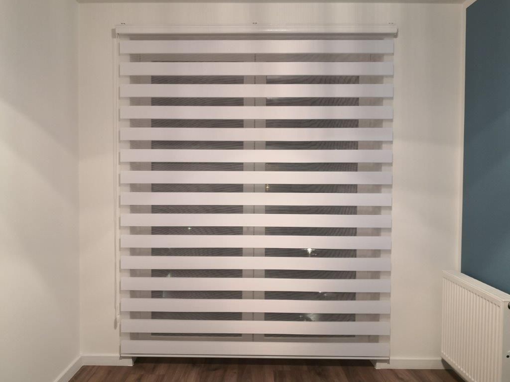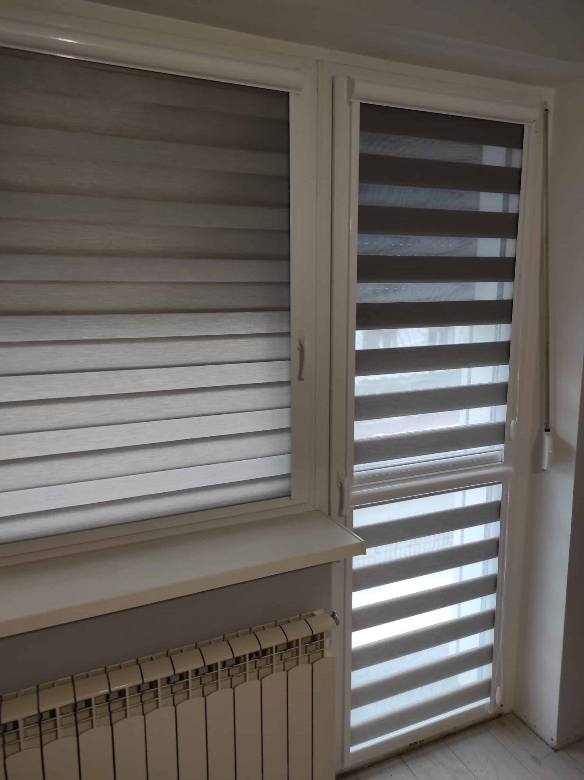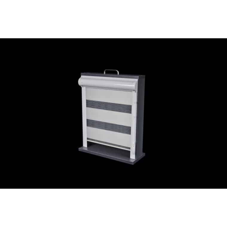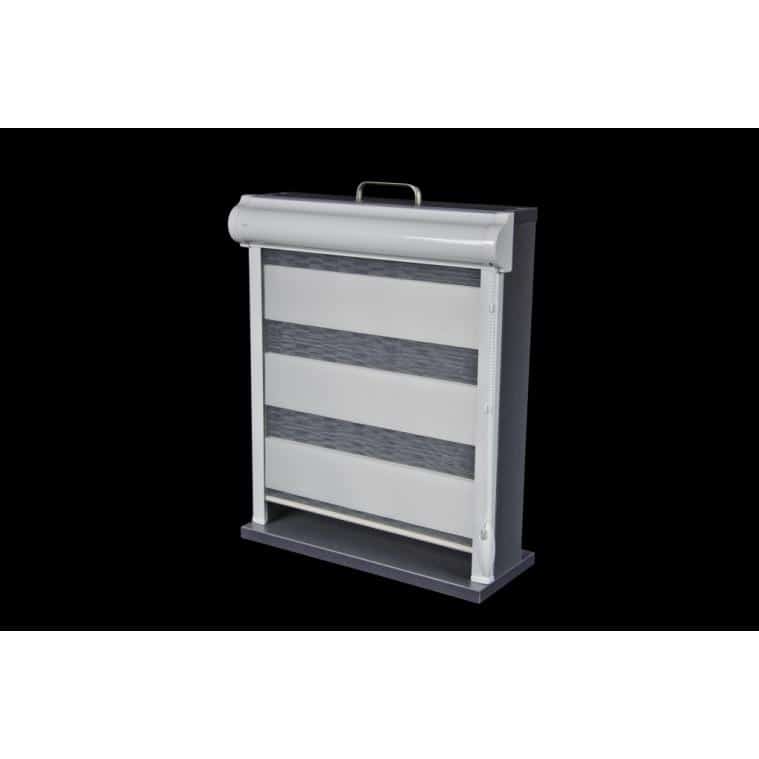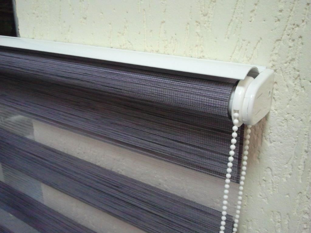 Została tutaj zastosowana tkanina z poziomymi pasami, które w układzie pionowym tkaniny, zmieniają się naprzemiennie z pasa transparentnego w zaciemniający. Jeden koniec tkaniny jest przyklejony do rury nawojowej i za pomocą mechanizmu łańcuszkowego nawijany na nią i rozwijany. Drugi koniec tkaniny jest natomiast wsunięty w zamocowaną na górze szynę. Dzięki temu zabiegowi tworzą się (w pewnym sensie) dwie powierzchnie tkaniny – przednia i tylna. Podczas rozwijania i zwijania tkaniny, spotykają się pasy obu powierzchni. Gdy pas zaciemniający przedniej powierzchni, pokryje taki sam pas na tylnej, a zarazem pas transparentny pokryje swój odpowiednik, to wtedy tkanina przepuszcza światło (częściowo) i powstaje pozycja tzw. „dzień”. Gdy natomiast w ruchu tkaniny spotkają się pasy zaciemniające przedniej powierzchni, z pasami transparentnymi tylnej powierzchni, to wtedy następuje zamknięcie rolety na światło dzienne i powstaje pozycja „noc”. Dużą zaletą rolet „dzień i noc” jest możliwość regulacji intensywności naświetlenia osłanianego pomieszczenia.