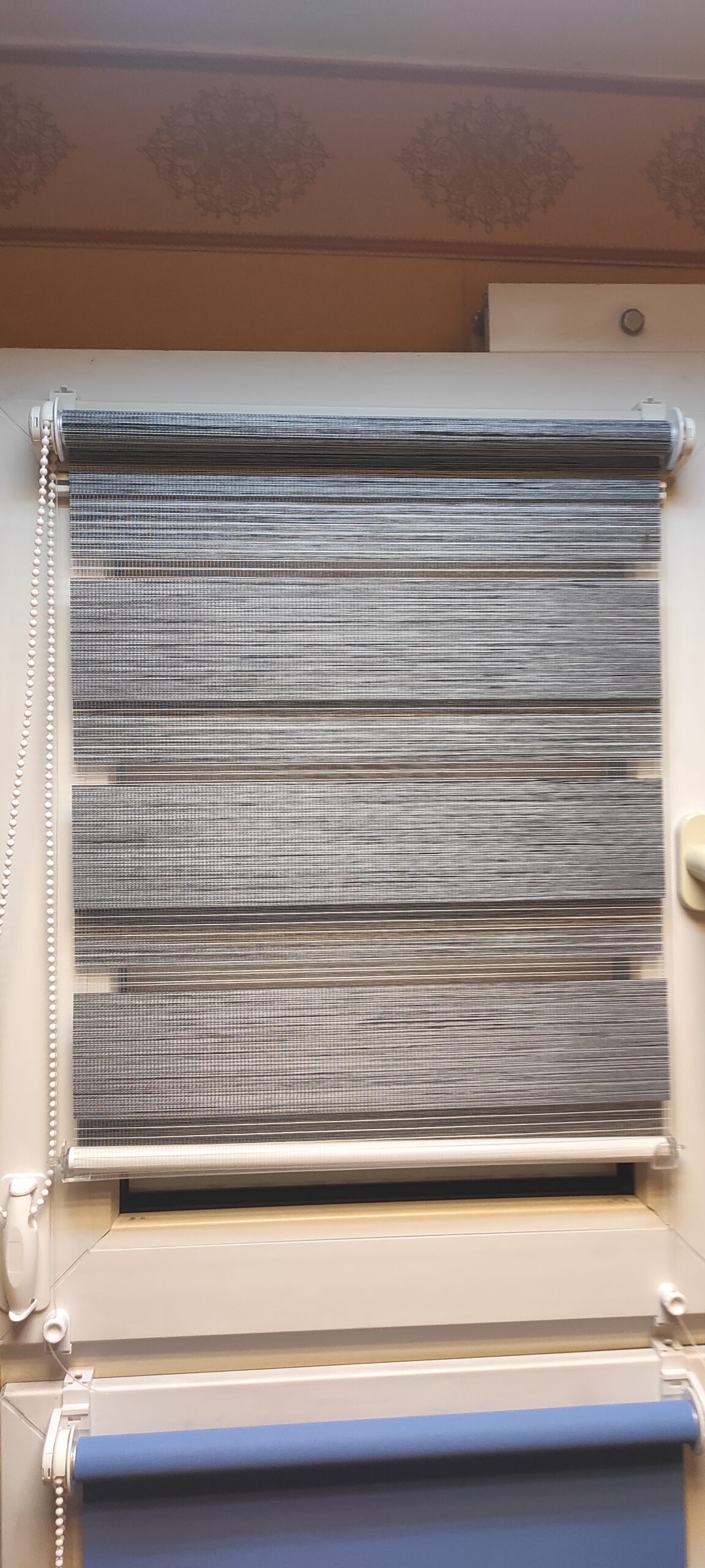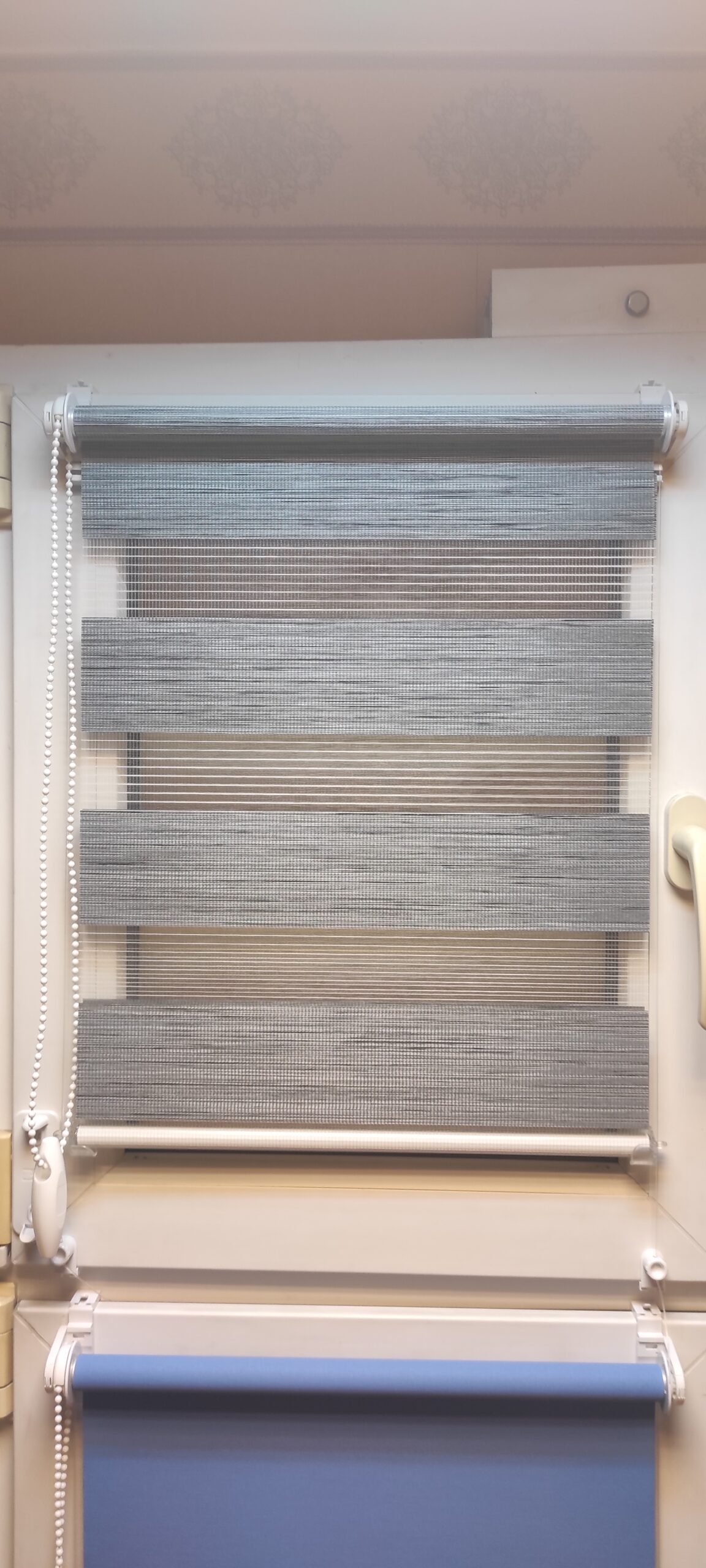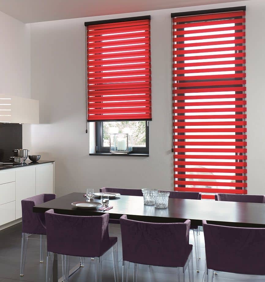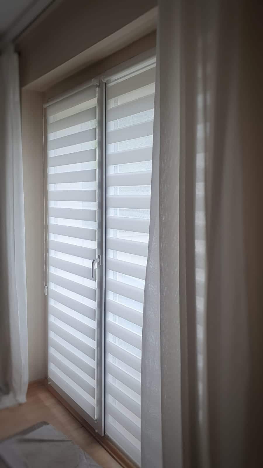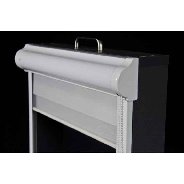 Została tutaj zastosowana tkanina z poziomymi pasami, które w układzie pionowym tkaniny, zmieniają się naprzemiennie z pasa transparentnego w zaciemniający. Jeden koniec tkaniny jest przyklejony do rury nawojowej i za pomocą mechanizmu łańcuszkowego nawijany na nią i rozwijany. Drugi koniec tkaniny jest natomiast wsunięty w zamocowaną na górze szynę. Dzięki temu zabiegowi tworzą się (w pewnym sensie) dwie powierzchnie tkaniny – przednia i tylna. Podczas rozwijania i zwijania tkaniny, spotykają się pasy obu powierzchni. Gdy pas zaciemniający przedniej powierzchni, pokryje taki sam pas na tylnej, a zarazem pas transparentny pokryje swój odpowiednik, to wtedy tkanina przepuszcza światło (częściowo) i powstaje pozycja tzw. „dzień”. Gdy natomiast w ruchu tkaniny spotkają się pasy zaciemniające przedniej powierzchni, z pasami transparentnymi tylnej powierzchni, to wtedy następuje zamknięcie rolety na światło dzienne i powstaje pozycja „noc”. Dużą zaletą rolet „dzień i noc” jest możliwość regulacji intensywności naświetlenia osłanianego pomieszczenia.